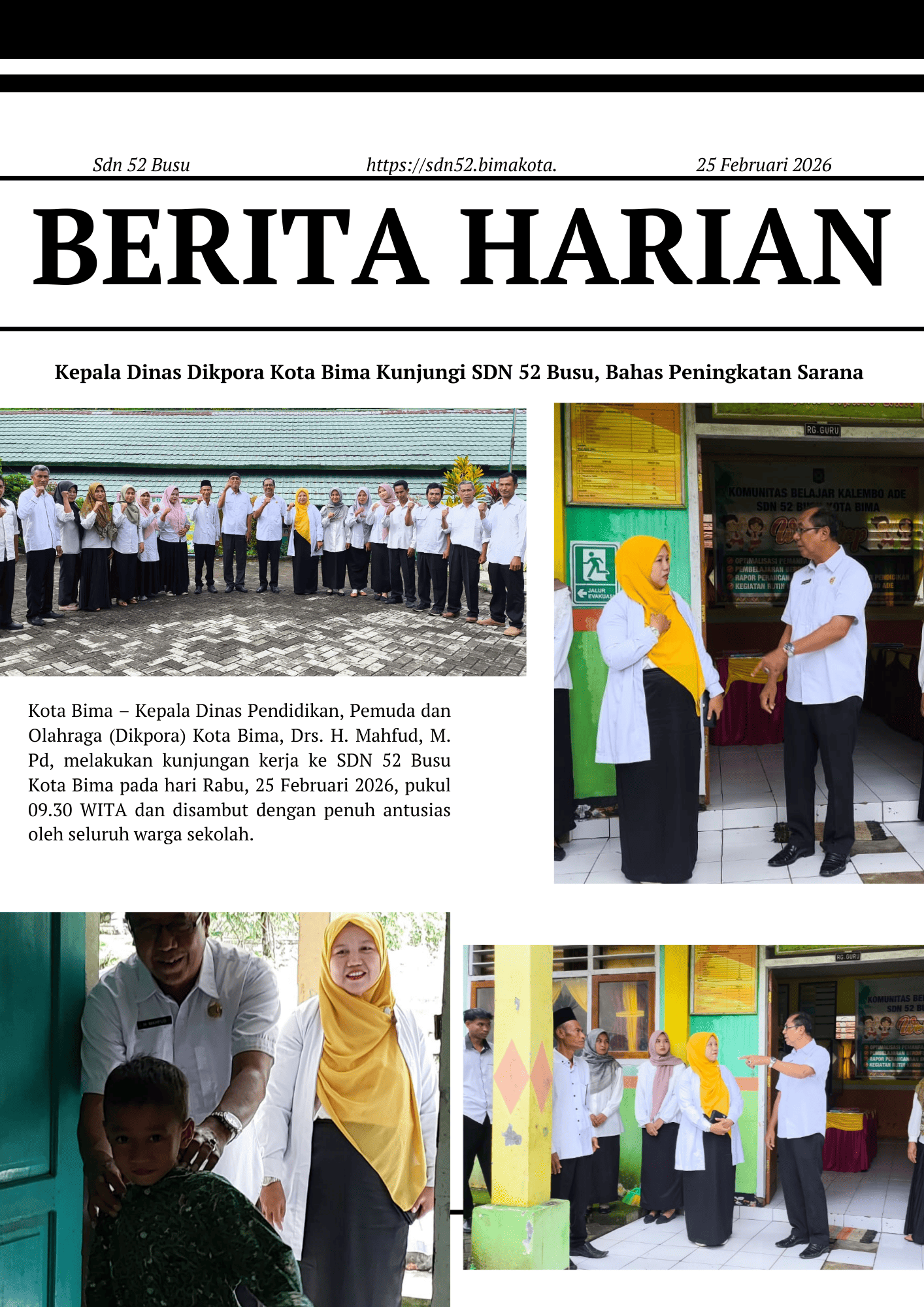 Kota Bima – Kepala Dinas Pendidikan, Pemuda dan Olahraga (Dikpora) Kota Bima, Drs. H. Mahfud, M. Pd, melakukan kunjungan kerja ke SDN 52 Busu Kota Bima pada hari Rabu, 25 Februari 2026, pukul 09.30 WITA dan disambut dengan penuh antusias oleh seluruh warga sekolah.